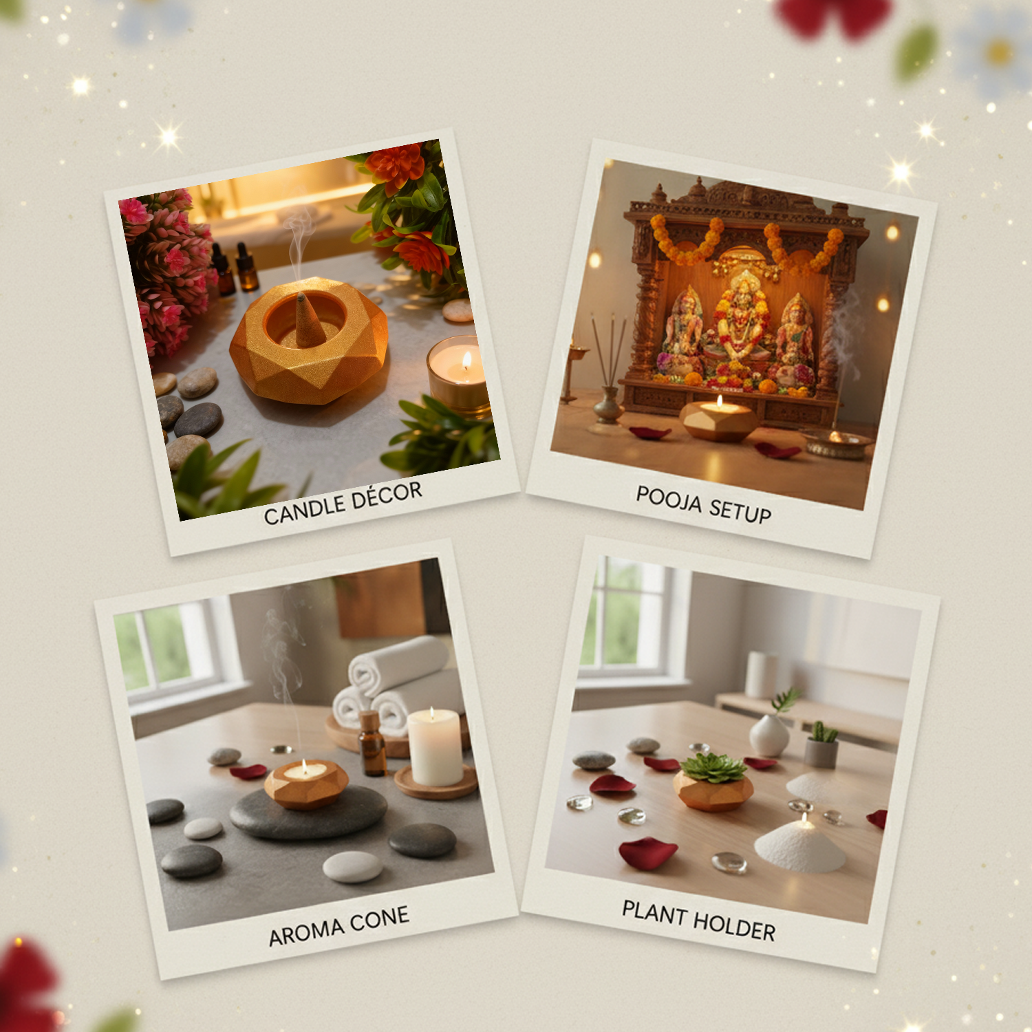 You can use it as a Tealight Candle Holder for Diwali, festive décor, romantic evenings, and gifting purposes. It works perfectly as a Pooja Diya Stand for daily rituals and spiritual settings. It can also be used as a Dhoop Cone Holder to create a calming aromatic atmosphere during meditation or yoga sessions. Additionally, it serves as a Mini Planter for small succulents or indoor plants and can be used as a decorative base for sand wax or gel candles for DIY décor projects.