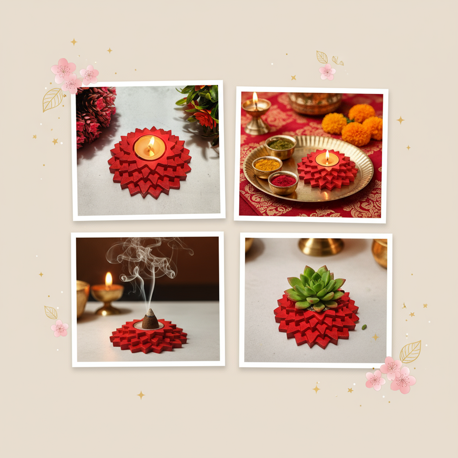You can use it as a Tealight Candle Holder for Diwali, festive décor, romantic evenings, and gifting purposes. It works perfectly as a Pooja Diya Stand for daily rituals and spiritual settings. It can also be used as a Dhoop Cone Holder to create a calming aromatic atmosphere during meditation or yoga sessions. Additionally, it serves as a Mini Planter for small succulents or indoor plants and can be used as a decorative base for sand wax or gel candles for DIY décor projects.
