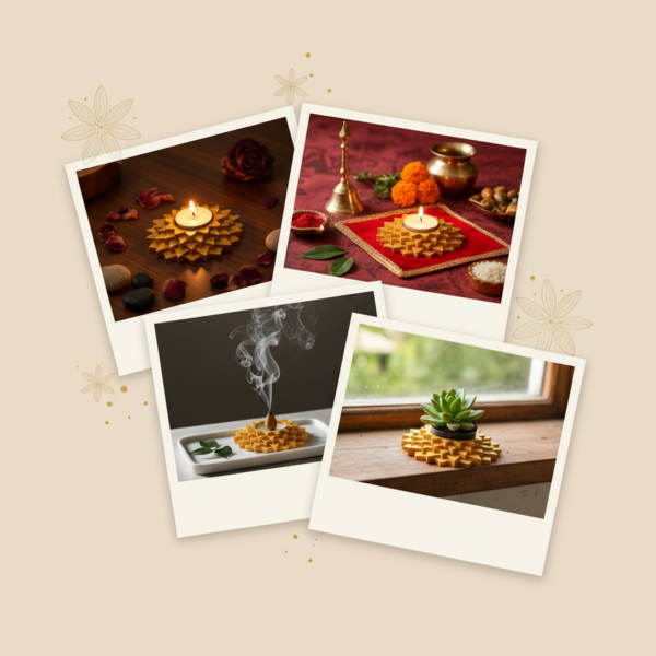 You can use it as a Tealight Candle Holder for Diwali, festive décor, romantic evenings, and gifting purposes. It works perfectly as a Pooja Diya Stand for daily rituals and spiritual settings. It can also be used as a Dhoop Cone Holder to create a calming aromatic atmosphere during meditation or yoga sessions. Additionally, it serves as a Mini Planter for small succulents or indoor plants and can be used as a decorative base for sand wax or gel candles for DIY décor projects.